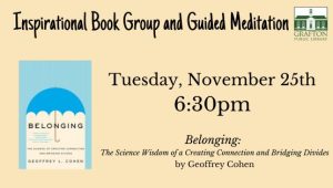 Join us on Tuesday, November 25th at 6:30pm, in Room 228 for the Inspirational Book Group and Guided Meditation discussion of Belonging : the science of creating connection and bridging divides, by Geoffrey L. Cohen.